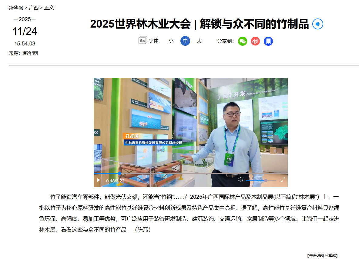 11月22日,以“林木绿业 合作共襄——数智赋能林木业高质量发展”为主题的2025年世界林木业大会在广西南宁举行。大会由广西壮族自治区政府与中国林产工业协会联合主办,围绕人工智能、绿色转型等议题展开,吸引全球30余个国家的行业代表参与。作为林业行业新质生产力的代表,竹缠绕复合材料精彩亮相大会收获颇多驻足,并受到新华网的重点关注和报道,以下为报道全文: